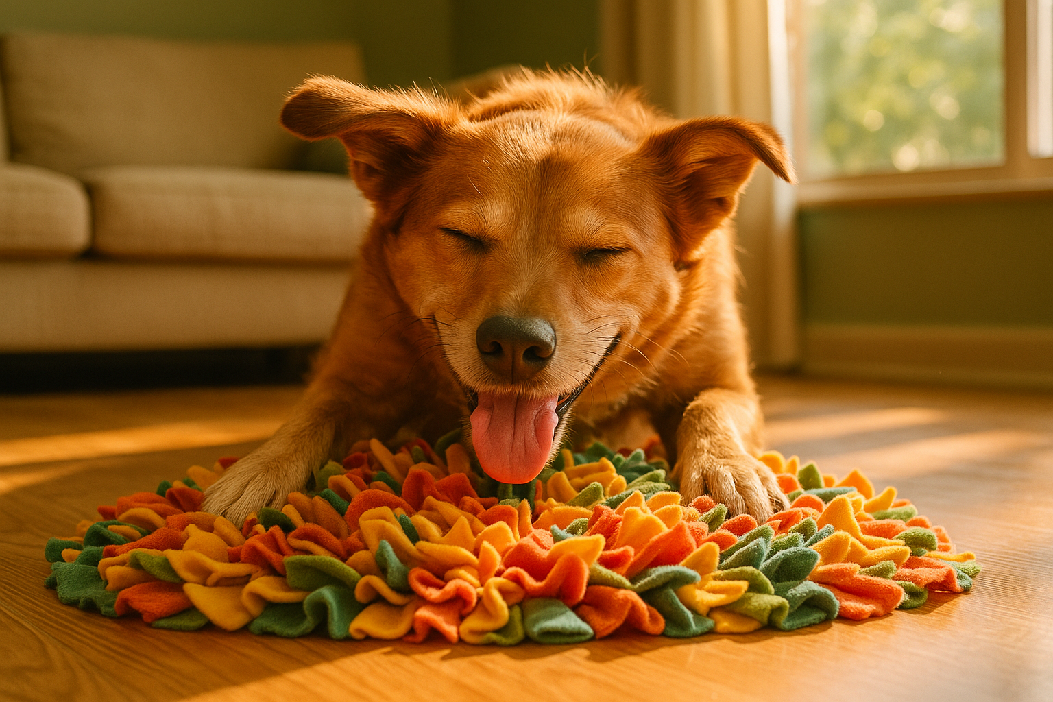 A snuffle mat is basically a fluffy rubber mat with tons of hiding spots for kibble or treats. Your dog uses their nose to sniff out every last morsel, and it takes forever compared to eating from a bowl. It's calming, tiring, and deeply satisfying for them.